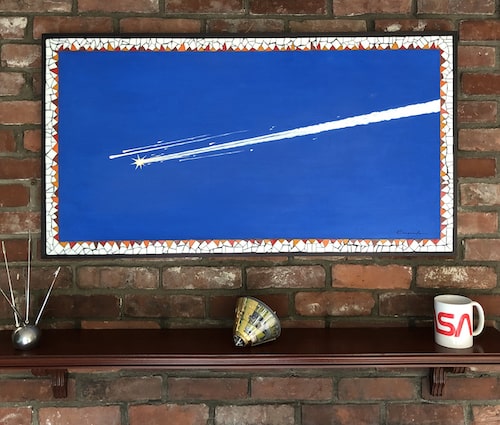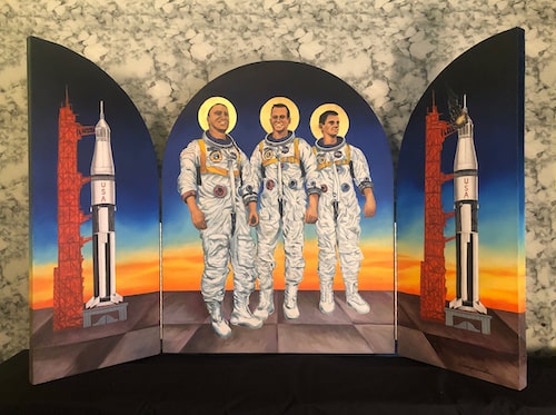 Tacos El Gordo 2020. Oil on canvas, 40” x 30”Description: Vernal, Utah is dinosaur country. It’s also a great place for gas station cuisine. Orbit 2001. Oil on canvas, 10” x 8” Description: I dabble in philately, so it’s no wonder I took inspiration from the 1962 “Project Mercury” 4-cent U.S. postage stamp. UNsinkable 2016. Oil on canvas, 24” x 18”Description: A U.S. Navy frogman shepherds capsule and crew of Gemini 3 back to the recovery ship after a successful return to planet Earth. Apollo 1 (Grissom, White, Chaffee) 1994 – 2003. Oil on canvas triptych, 48” x 30” Description: Fire in the cockpit, no survivors. An altar piece tribute to the three astronauts who perished on January 27, 1967. Challenger 2003. Oil on canvas, 36” x 18”Description: The explosion of the space shuttle Challenger on January 28, 1986, as seen from a windswept Florida beach. Columbia 2003. Oil on canvas with glass tile border, 36” x 18”Description: The disintegration of the space shuttle Columbia on February 1, 2003, upon re-entry after its 16-day mission. Page 1 Page 2 Page 3